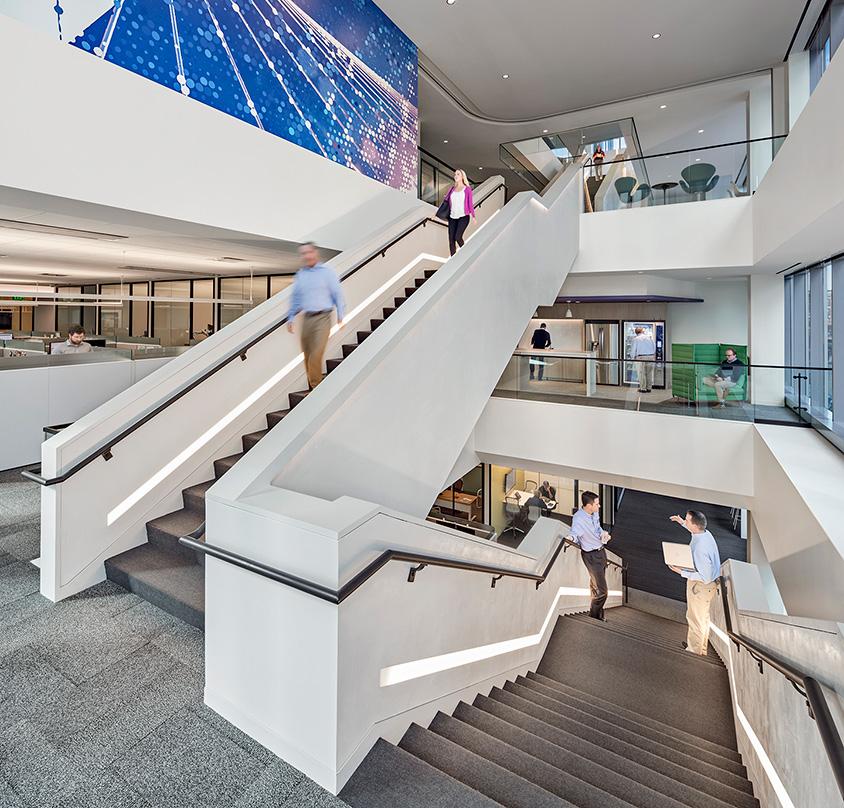 - Creating a central staircase connecting multiple floors to encourage vertical interaction across teams.