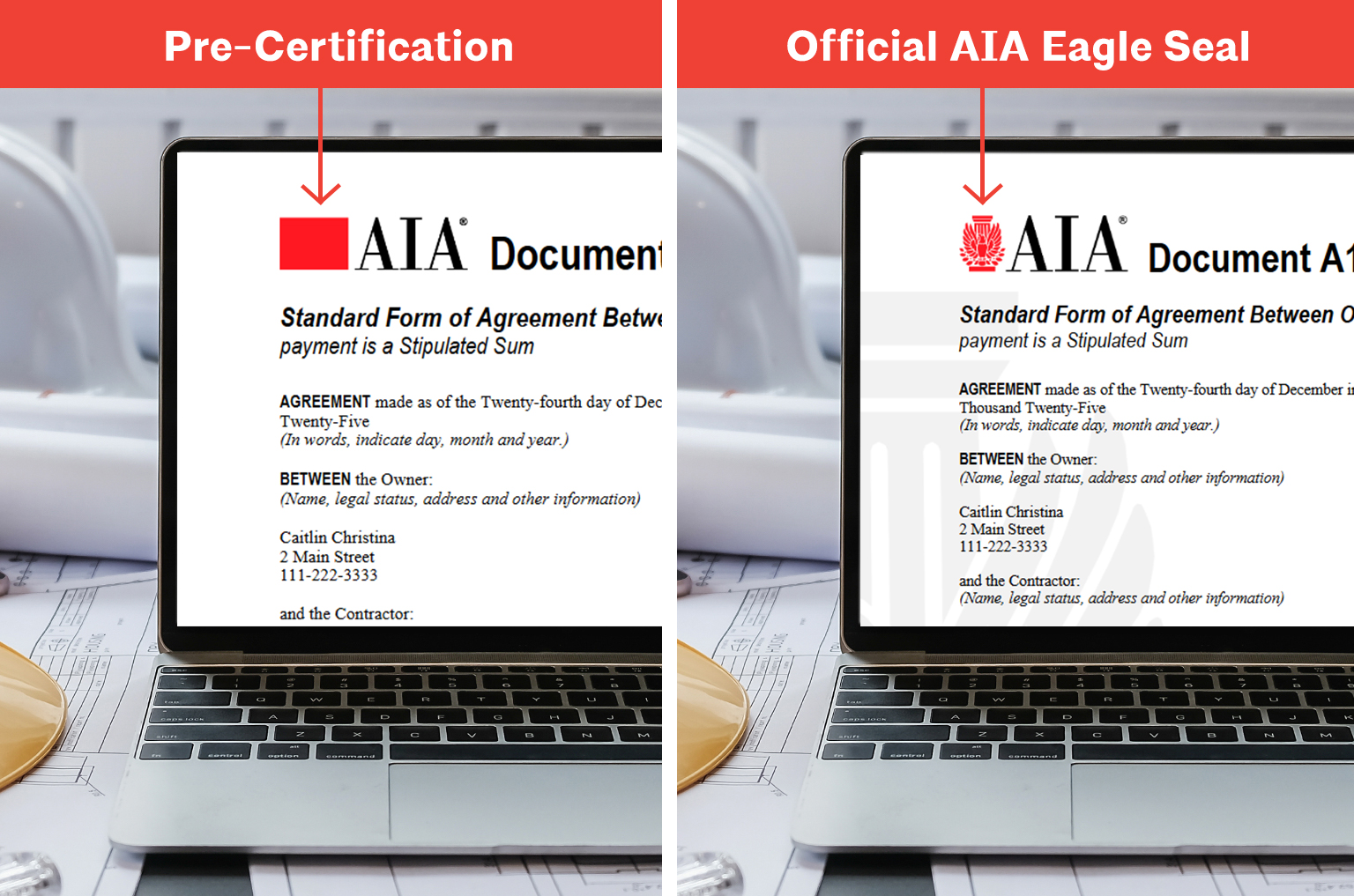 Prior to Certification, an AIA Contract Document displays the AIA logo with a red rectangle to its left in the header. All pages of the pre-certified document are also marked with a “Draft” watermark. Once certified, this placeholder is replaced with the official AIA eagle seal, and an eagle watermark will be added to all pages.